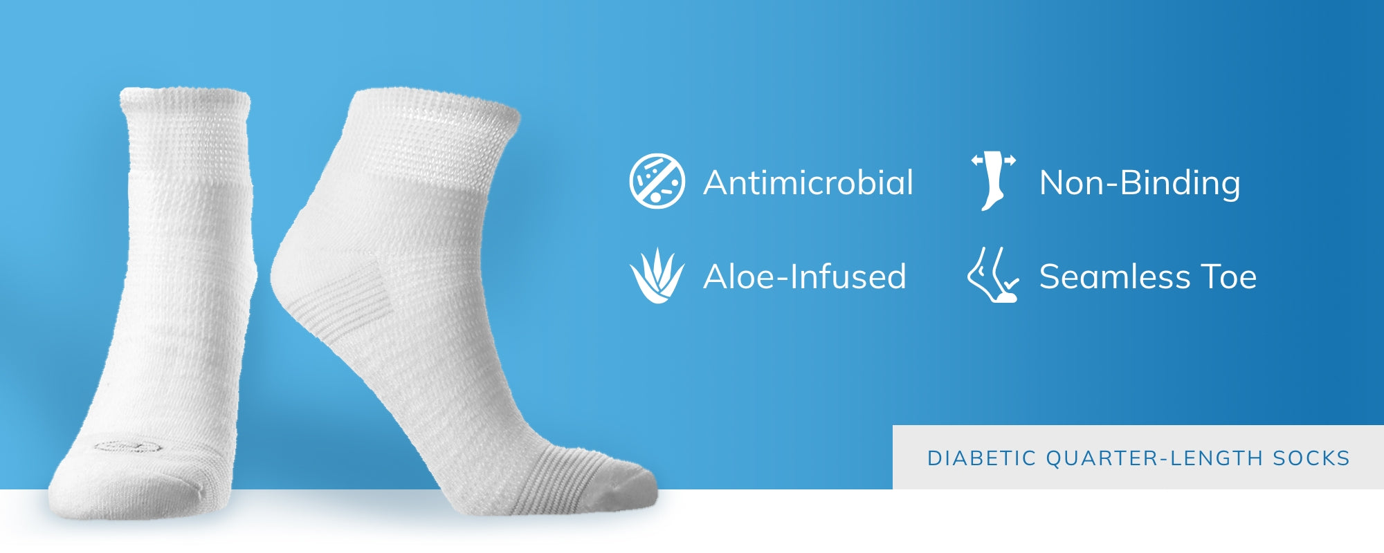 Our Diabetic Quarter-Length Socks feature moisture-wicking fibers, good ventilation to help keep feet dry, seamless toes, cushioning, and loose tops. These well-fitting socks are also aloe-infused to help promote smoother skin.